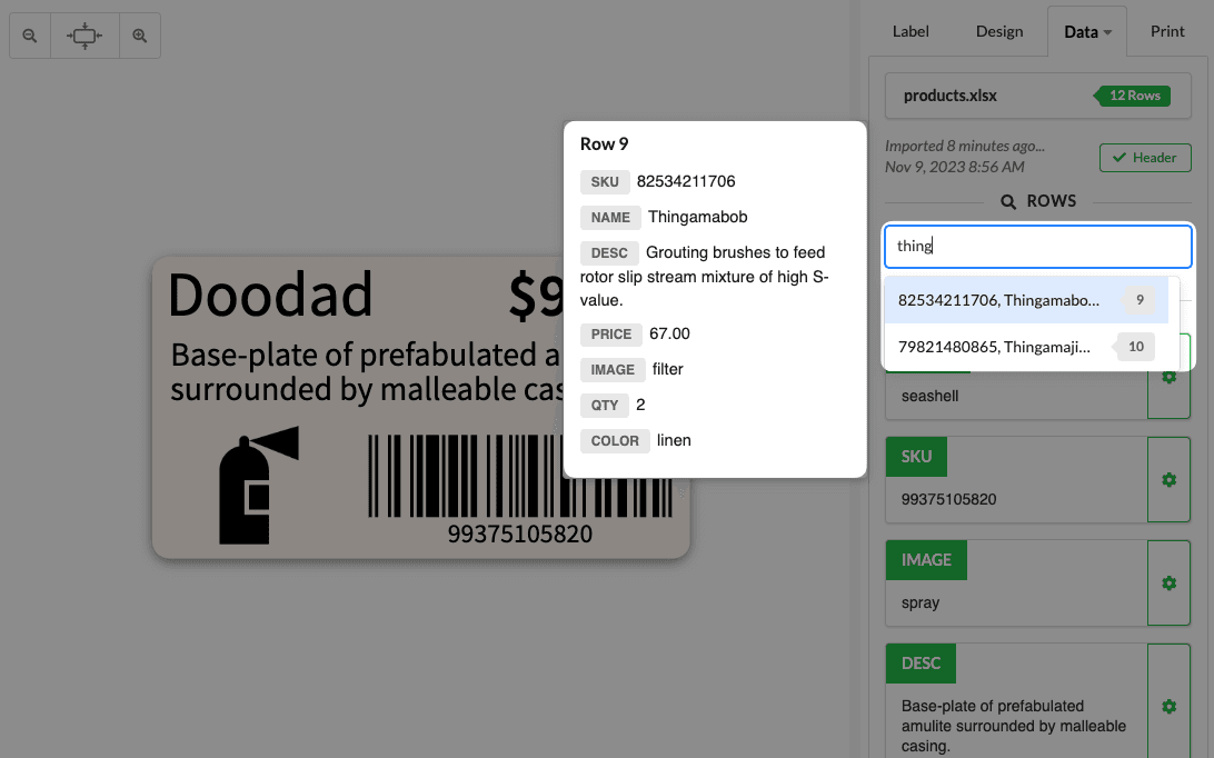 You can search, choose data rows, perform a match, or use a column for label copies.