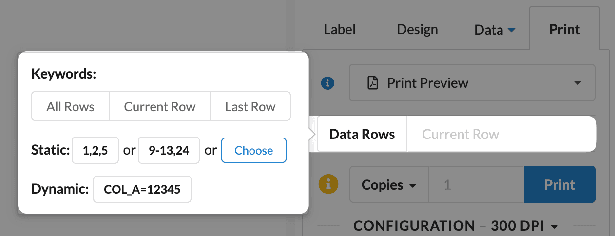 On the Print tab, click the Data Rows text box for examples. You can choose rows, enter individual row numbers, ranges (e.g. 1-4), or dynamic matching of column data.