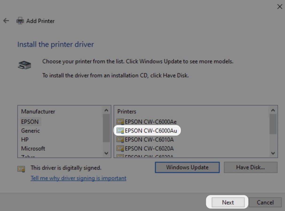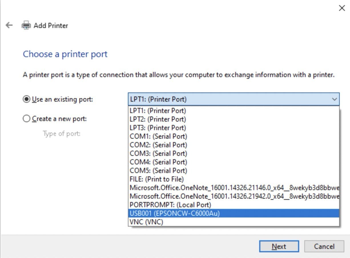 Choose the SAME PORT as the existing printer. Here, we're re-using the USB001 port that clearly shows the EPSONCW-C6000Au already in use. If you're using a network port then you will want to make the selection that reuses that same port.