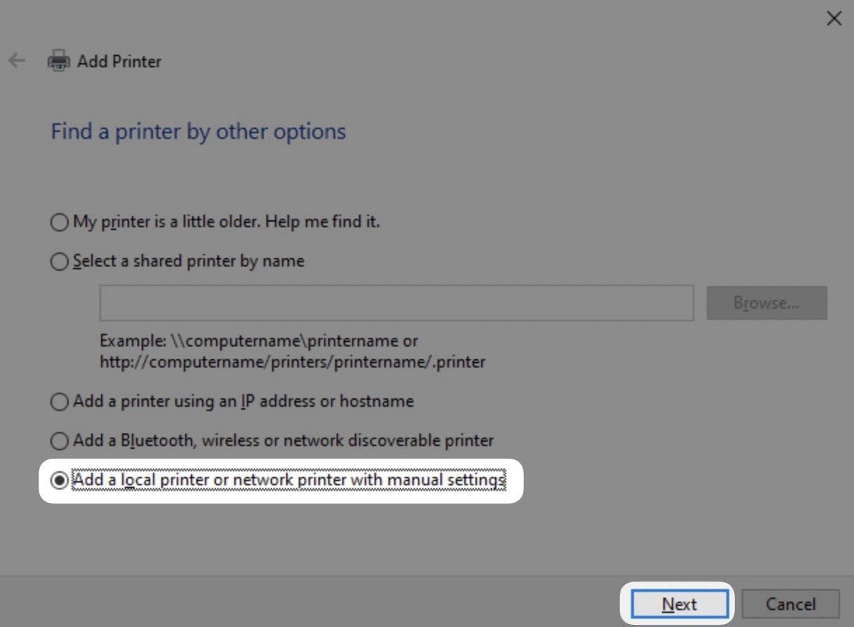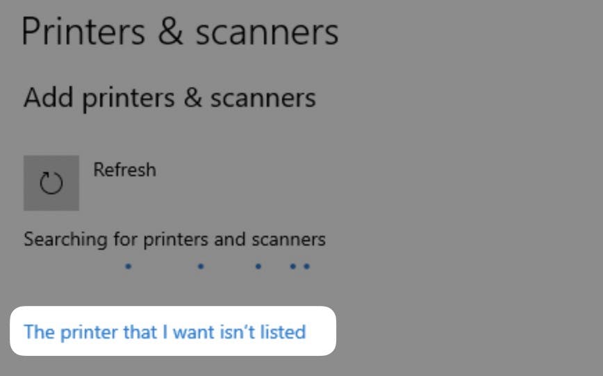 Wait a few seconds and click the blue text "The printer that I want isn't listed..."