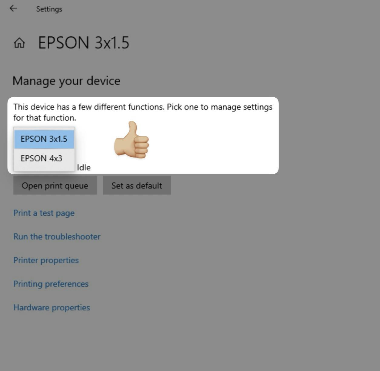 Repeat this process (both Printer properties and Printing preferences) for the other label size by changing the drop-down menu. The screenshot below is very confusing... note the drop-down has 4x3 selected. It seems we must read everything closely, yet ignore the upper-left printer name... which still shows the alternate name.