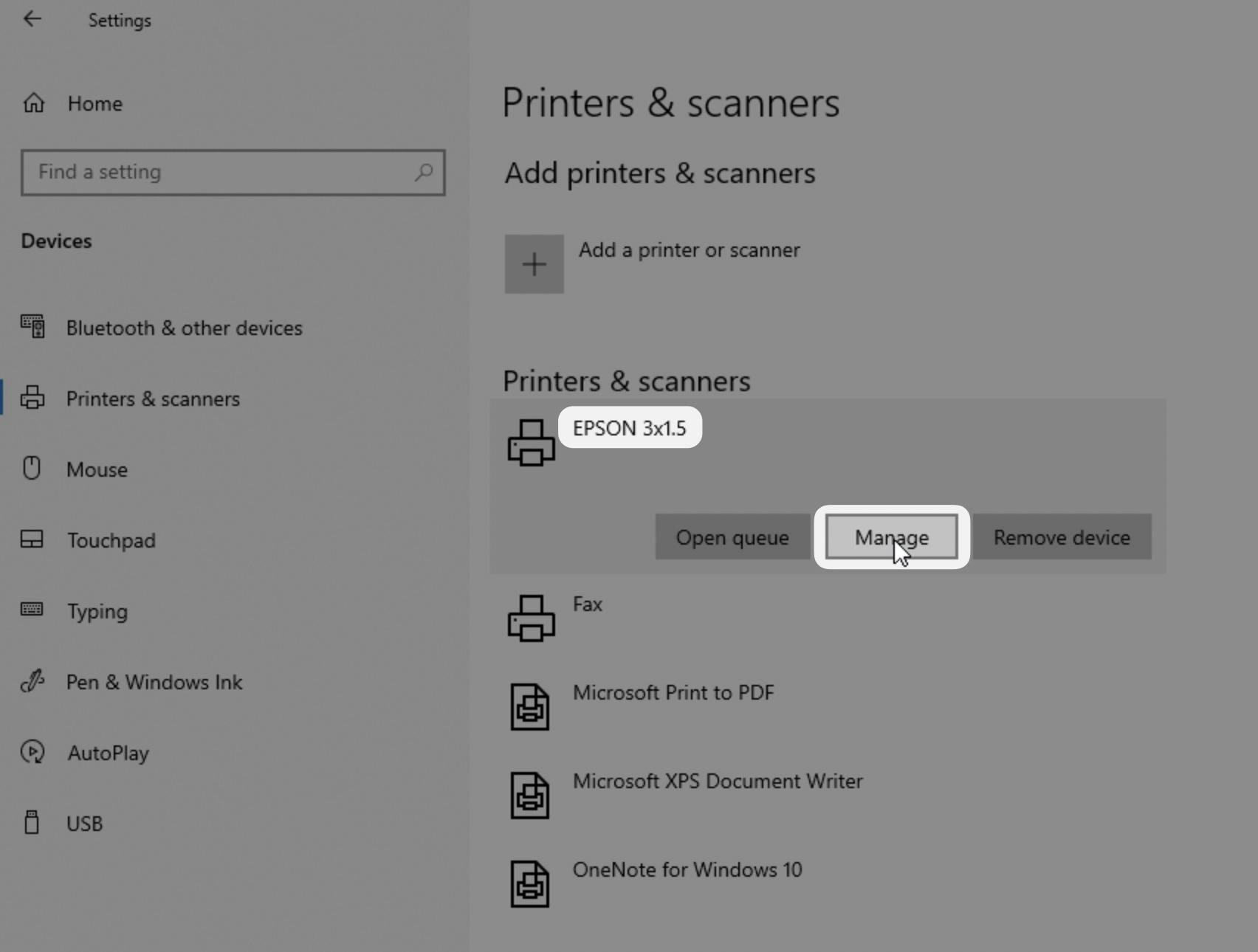 Chances are you have one printer installed and it looks like this. Click the printer's name and click Manage.