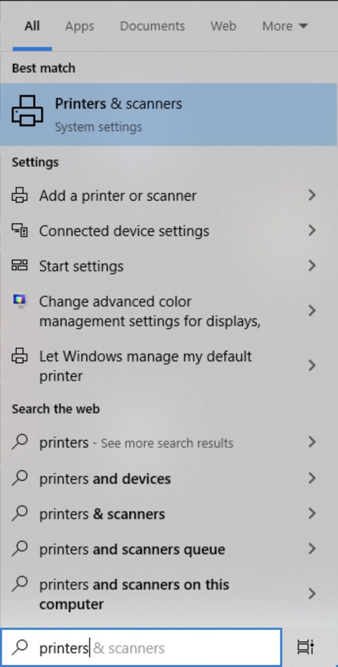 In the world of Windows, printers consume and eject media (e.g. labels, tags, paper). Each Windows printer can be pre-configured with different media settings (e.g. width and height). To access these settings, click the Start menu and type "printer" and open "Printers and Scanners."