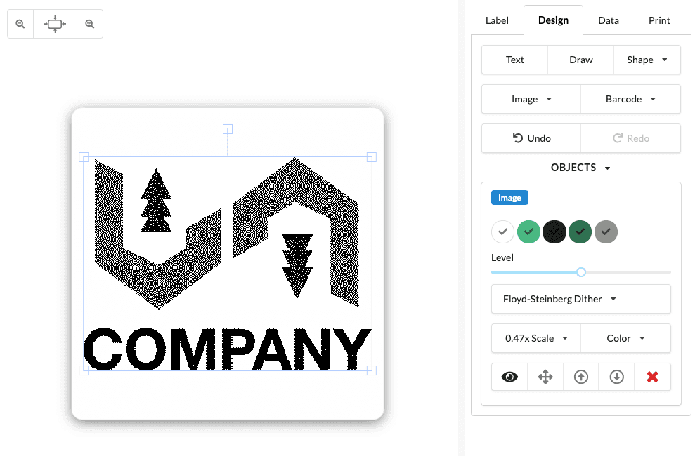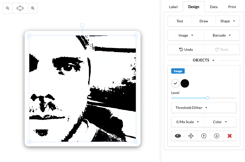 Your computer's screen has many more dots than the printer... so Label LIVE has to tell the printer exactly where to place the black dots. It does this using a technique called dithering. Label LIVE has built-in dithering for images. We recommend trying at least two: Threshold and Floyd-Steinberg. Test both and choose the one that works best for your label.